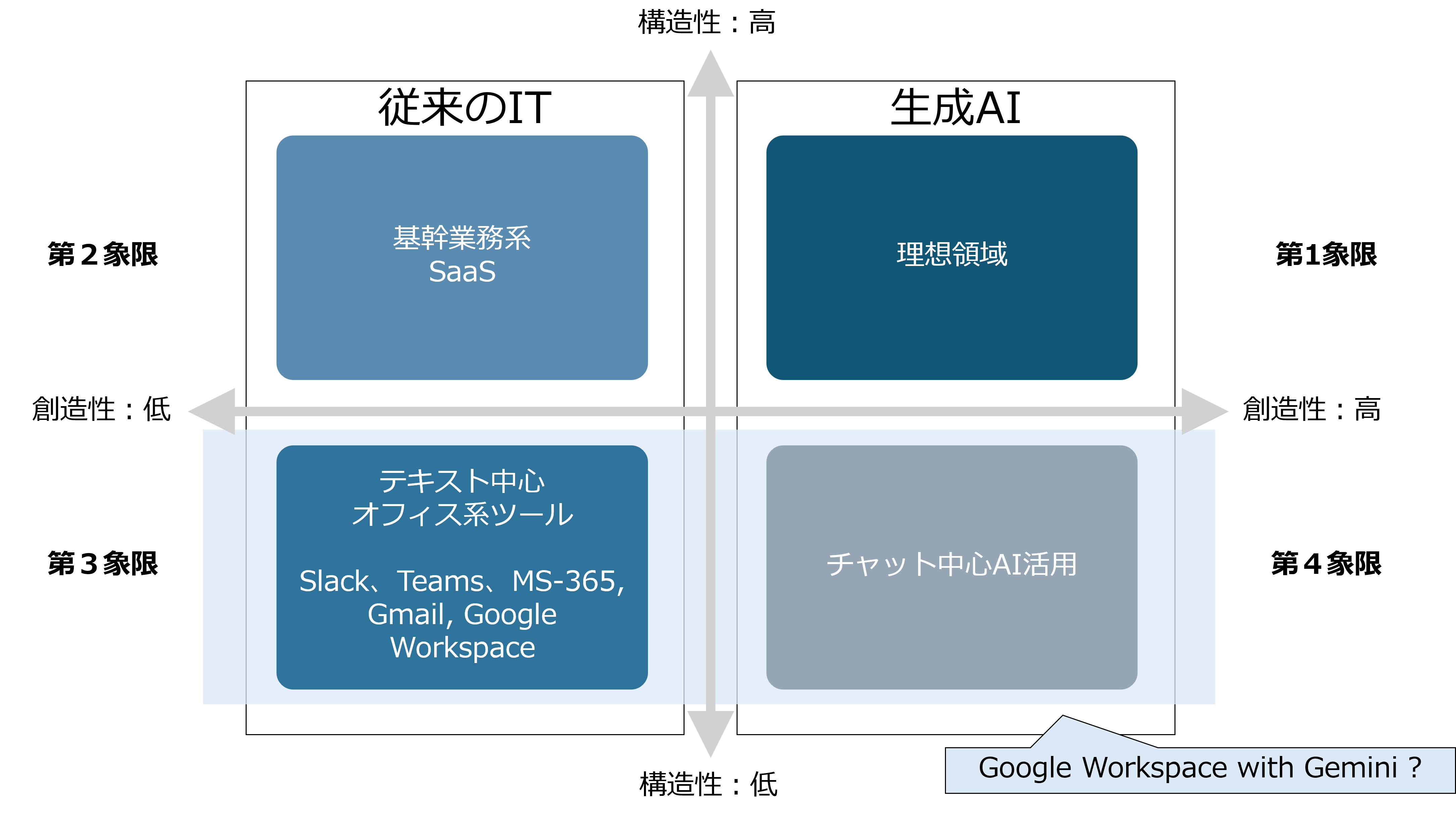 なぜならGeminiはチャット中心、つまり第4象限であり、Workspaceは第3象限だからです。