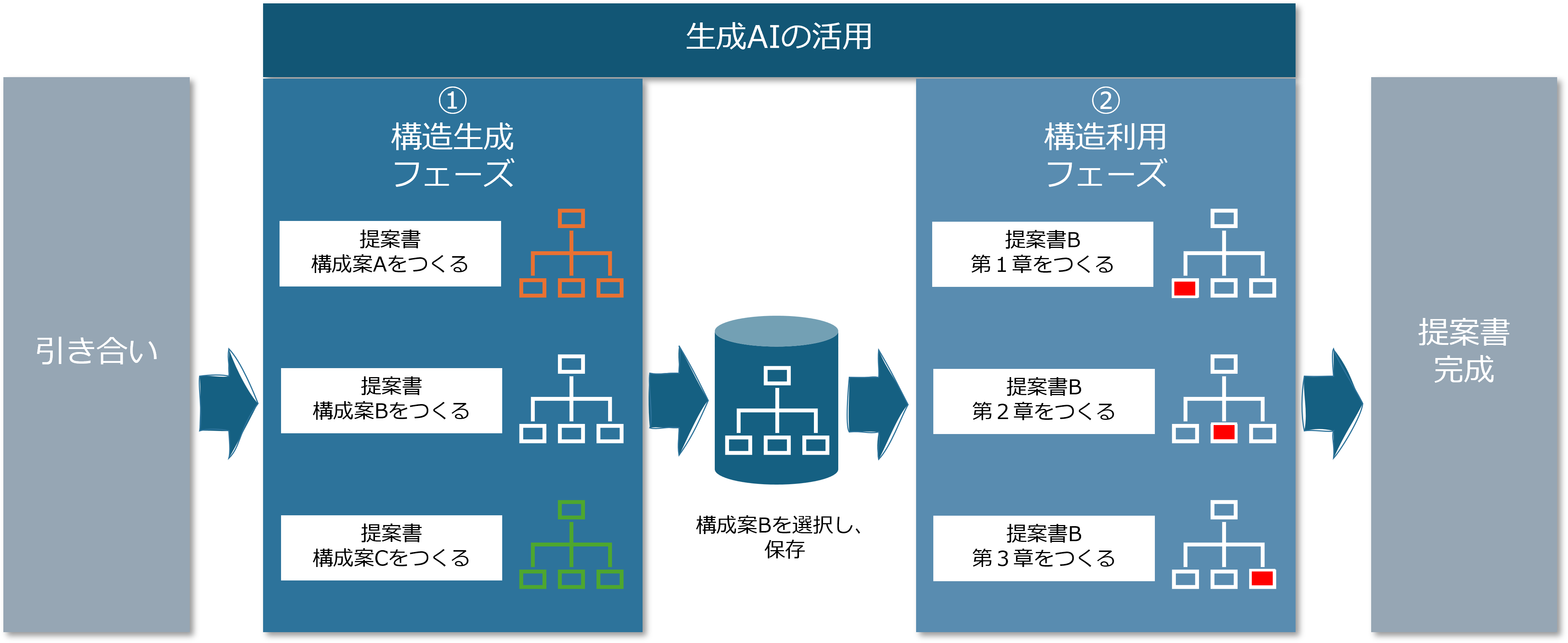 次の図は、2フェーズの生成AI活用を提案書の作成に当てはめた例です。フェーズ1の構造生成フェーズでは、提案書の構成、つまり章立てをいろいろと生成AIに作らせて検討し、採用が決定した構成案Bを保存しています。
