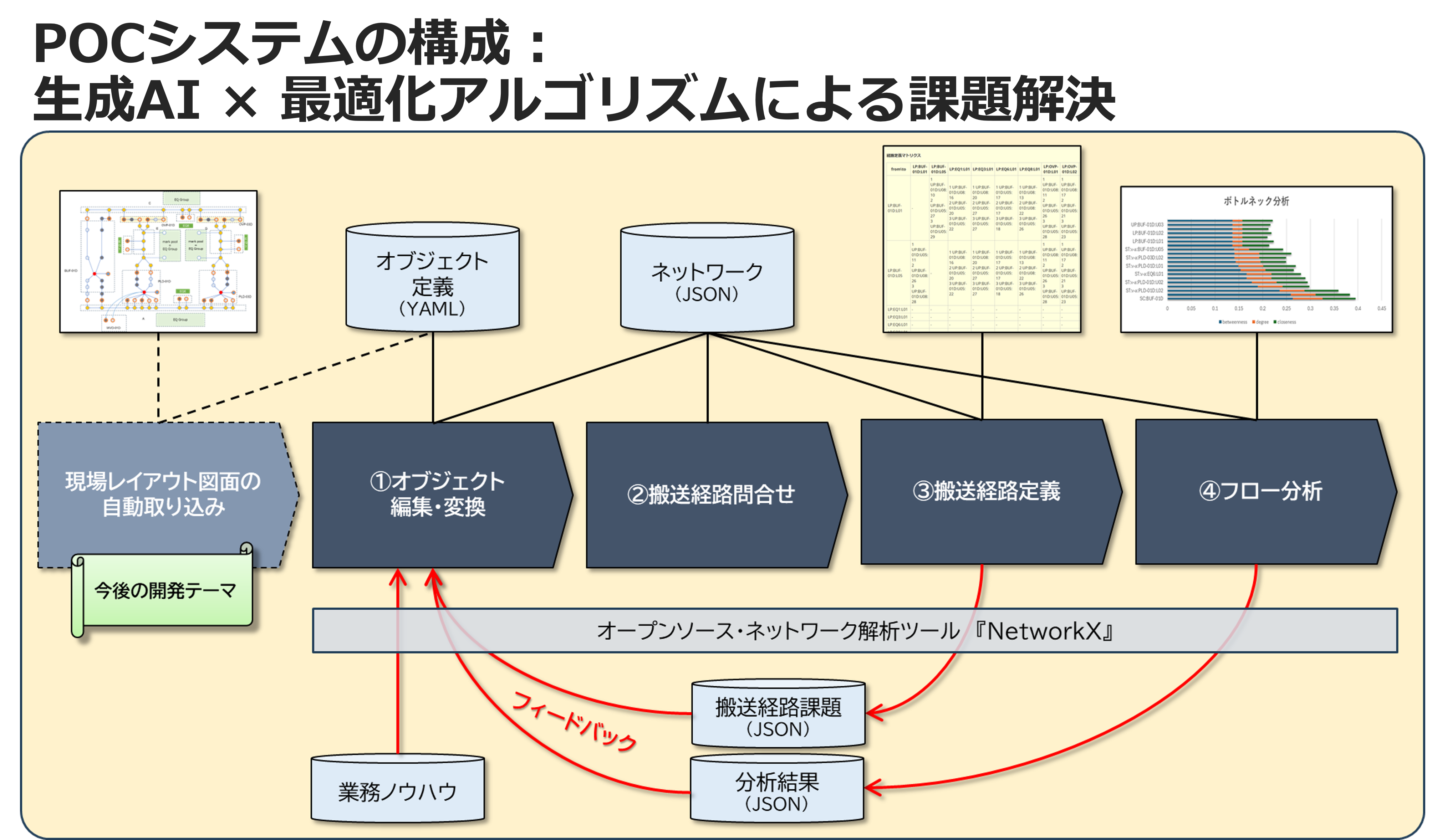 fusion AIがPOC(概念検証)で作り上げたのは、このような段階的なシステム設計を行うユーザーを支援する仕組みであり、そのために生成AIの言語能力と数理アルゴリズムを組み合わせました。